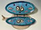 Two hand-formed oval serving trays with snake moon, and moth designs. The designs were applied using an underglaze decal, then covered with a clear glaze to keep the tray food safe. The clear was then coated with a wax resist to keep the dark blue glaze off of the decals. The entire tray was dipped in a blue glaze, and then a black glaze was lightly applied to the rim for an ethereal blue-black effect.